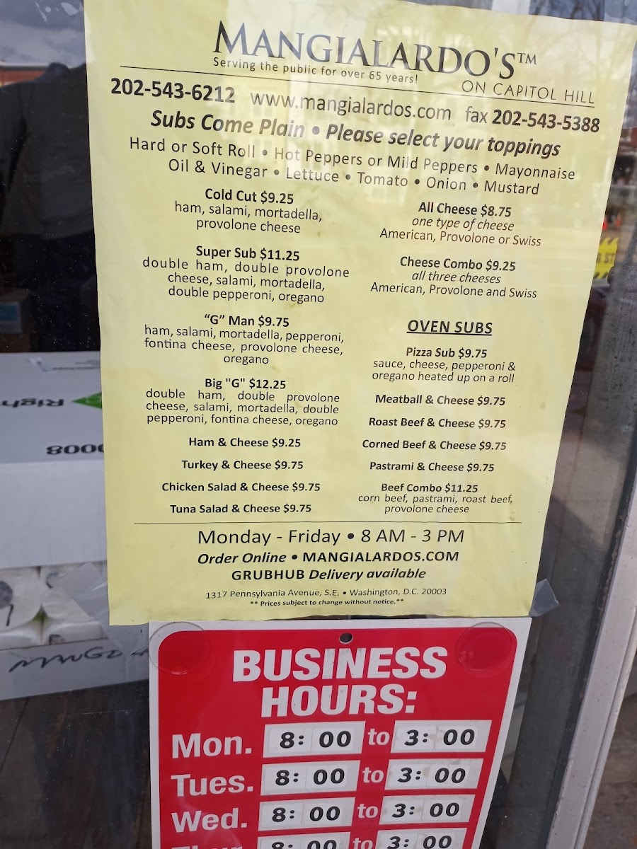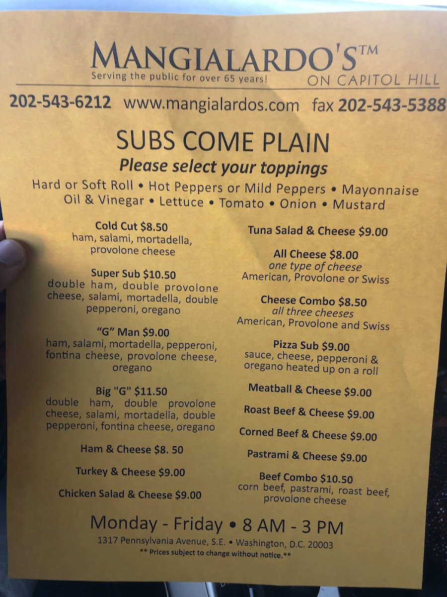 Welcome to Mangialardo's, a hidden gem located at 1317 Pennsylvania Ave. SE, Washington, DC. This establishment has been delighting locals since 1953, earning a reputation for its flavorful subs and friendly service. The menu showcases an impressive array of both cold and oven subs, with standout offerings like the Big G Sub and the G Man Sub, bursting with layers of meats and perfectly melted cheeses.